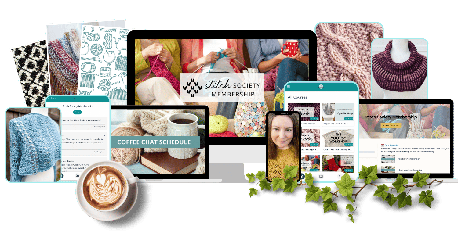 The Stitch Society is my warm, supportive monthly membership that includes a brand-new knitting pattern every month, an on-demand workshop library covering everything from lace to cables to socks to brioche, and more. Plus, you'll get to connect with wonderful fiber friends in our private community and join us for live Zoom stitch sessions so you never have to knit alone!